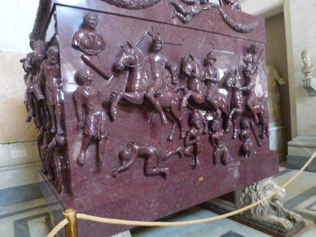 "ce sarcophage monumental fut réalisé pour accueillir la dépouile de Ste Hélène, puis restauré et transporté au Vatican en 1777, placé sur 4 lions sculptés. On distingue sur la caisse des scènes militaires où des cavaliers romains soumettent des prisionniers barbares : sur le couvercle, des éros et des victoires ailées tiennent des guirlandes, tandis que deux lions, l'un endormi, l'autre allongé, occupent les parties inclinées. La scène militaire, peu adaptée à un tombeau de femme, induit à penser que ce sarcophage était destiné à l'origne à un homme de la famille impériale, comme Constant Chlore ou, plus probablement, à Constantin lui-même" source : musée du Vatican.